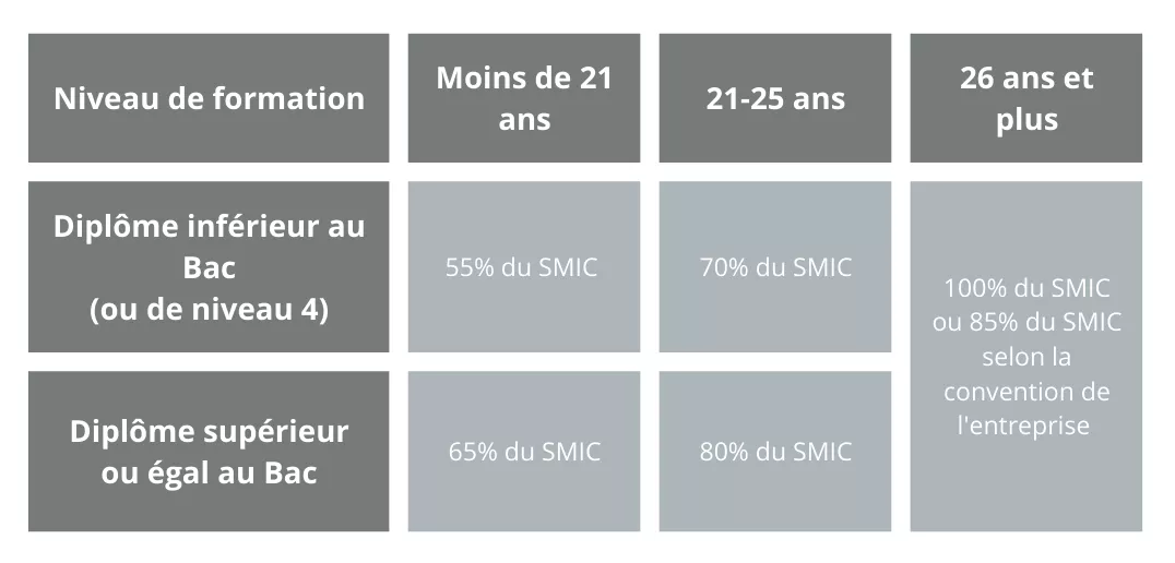 Cependant, les diplômes et titres concernés sont le Bac Professionnel, Technologique, CAP, BTS, Licence Professionnel ou diplôme d’ingénieur. Un étudiant titulaire d’un Bac Général sera rémunéré à la hauteur de 55% du SMIC pour les moins de 21 ans et 70% du SMIC pour les étudiants de 21 à 25 ans. Pour les 26 ans et plus, la rémunération ne peut pas être inférieure à 100% du SMIC ou 85 % du SMIC.